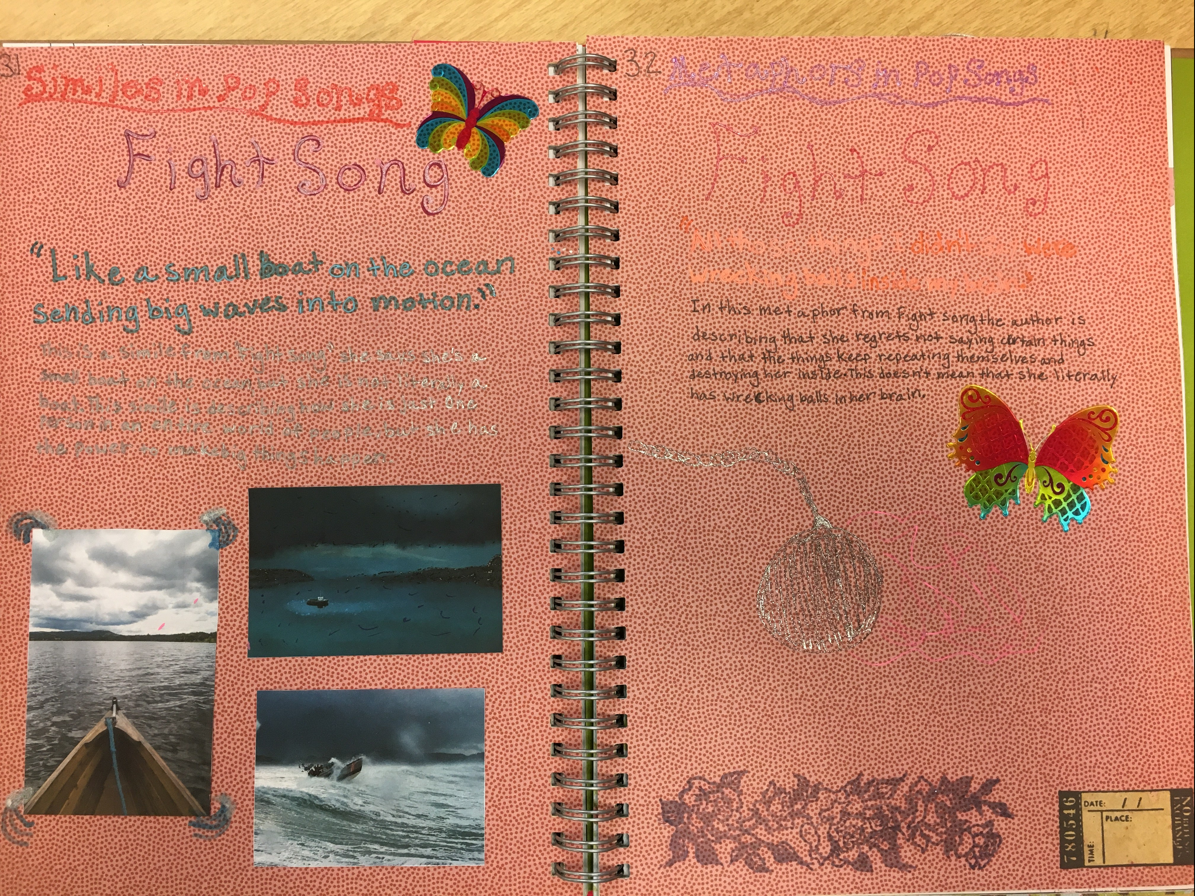 Below are some examples of student pages. As a freebie, here’s one guided page I’ve done whole class or as a station: Alliteration in Songs. For reference, here’s my calendar that I used this past year: Smashbook Calendar 2018