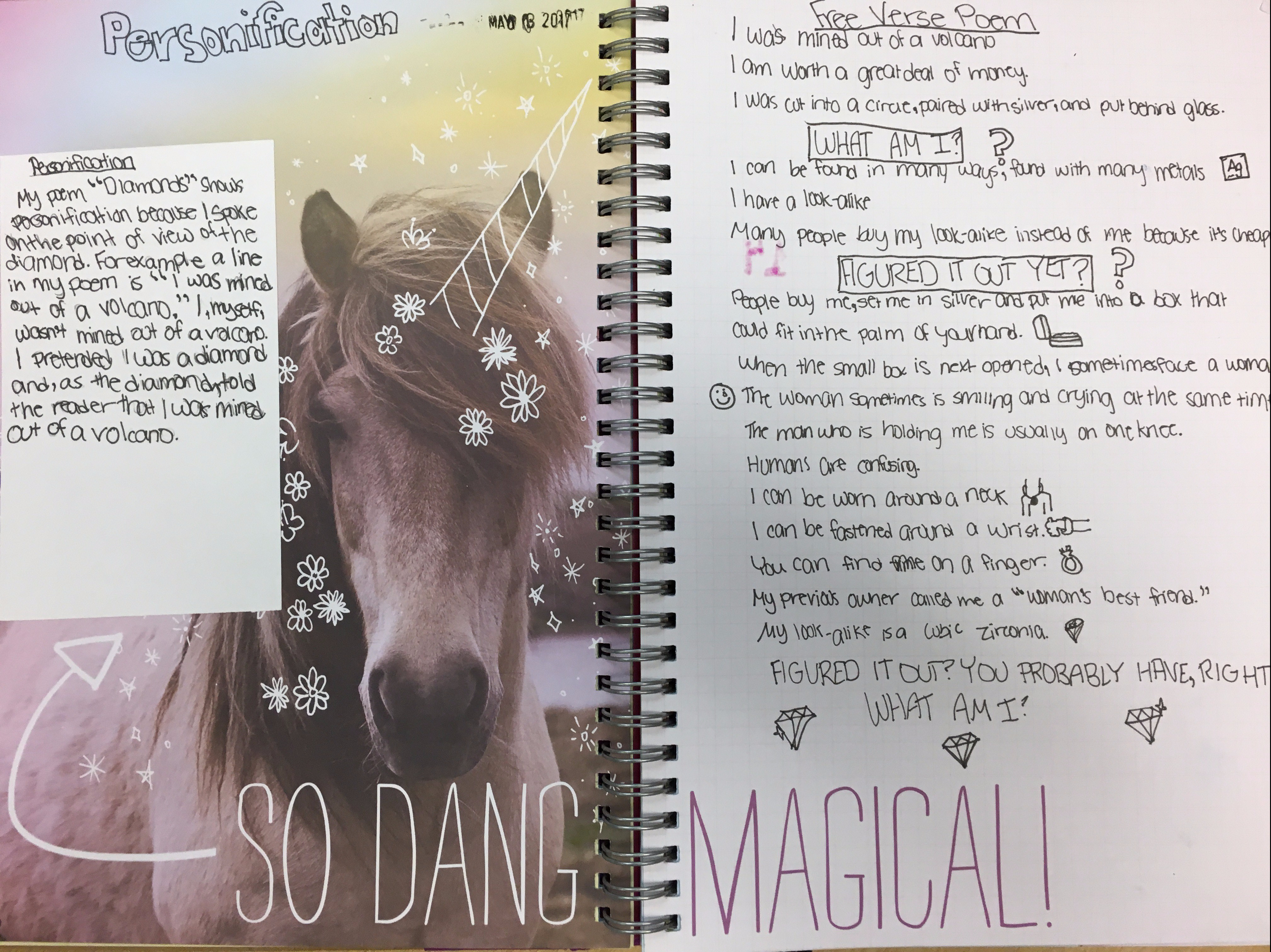 The goal of our Poetry Smashbook is to gather examples of poetry from popular culture as well as create our own poetry. We analyze songs and different texts to find and describe the figurative language embedded in the language we consume all the time. Students also read and write both traditional forms of poetry (ballad, haiku, limerick) as well as more free verse/free form styles of poetry. Here is the Table of Contents which students must complete: