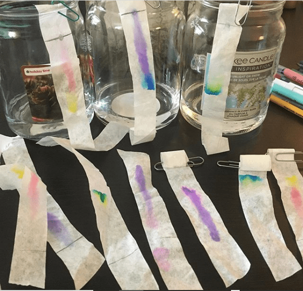- I set up chromatography using water in the bottom of jars, strips of coffee filters, and colored pens.