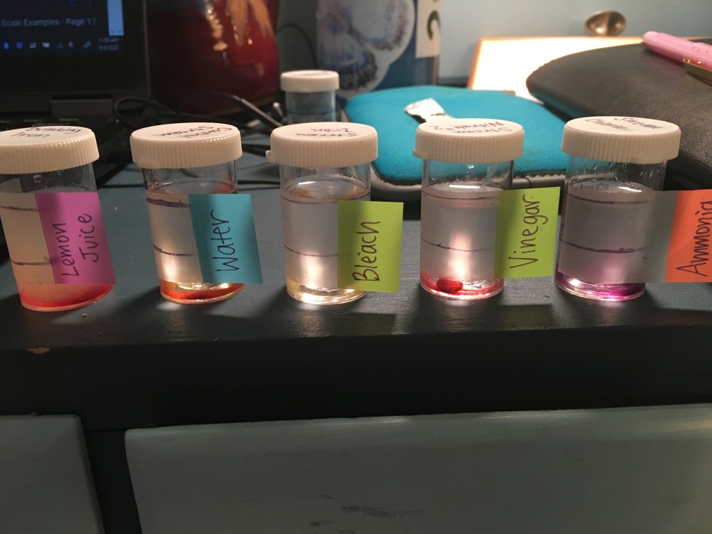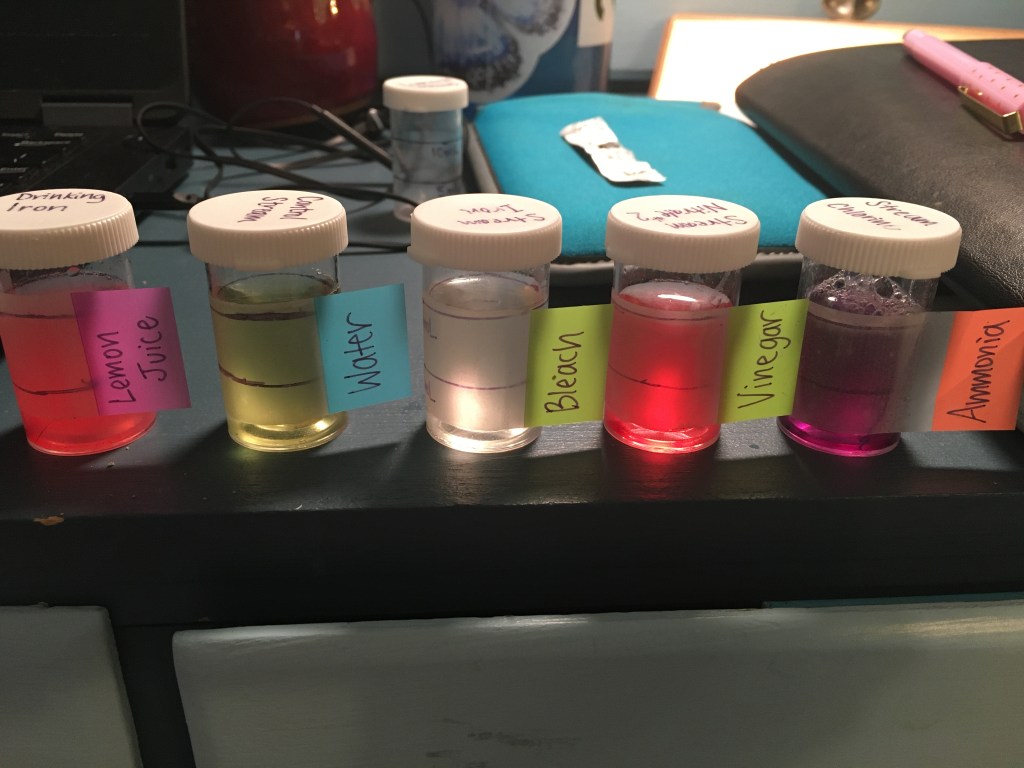 - I used pH tablets from the science kits we had at school to compare the pH of water, lime juice, ammonia, bleach (bad idea because it bleached out the pH tablet’s color…obviously), and vinegar. I wish I had done milk instead of bleach.
