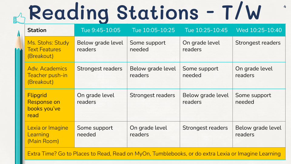 I have done a few structures. My favorite is to split the class into 4 groups, do two 20 minute stations the first day, then two more the next day. That was my favorite in person as well because it still gave me long enough at the beginning of class for a lesson, reflection exercise, a couple conferences as kids got started, a number sense routine, whatever I needed. I also will do 3 stations one day then 1 the other to give a longer whole class time. I also will do only 3 groups virtually which works well. In the classroom, I would not have done that because the groups feel way too large, but virtually, it’s not bad. It also means I can keep it all to one day. I also prefer to have 20 minutes with a slightly larger group than 15 minutes with a more ideal size. Since I have to manually move kids around in breakout rooms, the transition time is dependent on my skills and technology. Sometimes it takes me a few minutes to transition, and there’s nothing I can really do about it. 15 minutes can too easily become only 10.