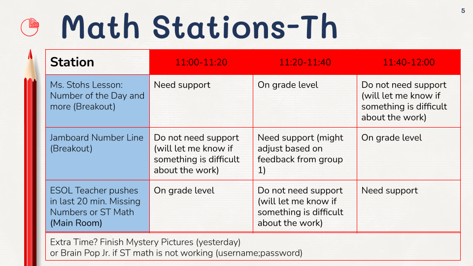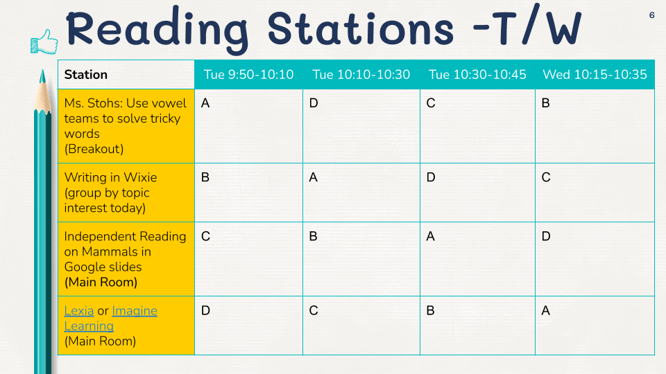 - I needed to make a plan to put everything all in one place. In the classroom, I can still monitor everything happening around me in the room. Even if I’m ignoring it, I can follow up with it later. Virtually, I have no idea what’s happening in a different breakout room or in the main room when I’m not there. I can’t have kids look at the easel or the board again for directions, so instead, I created a google slide that has all the directions again.