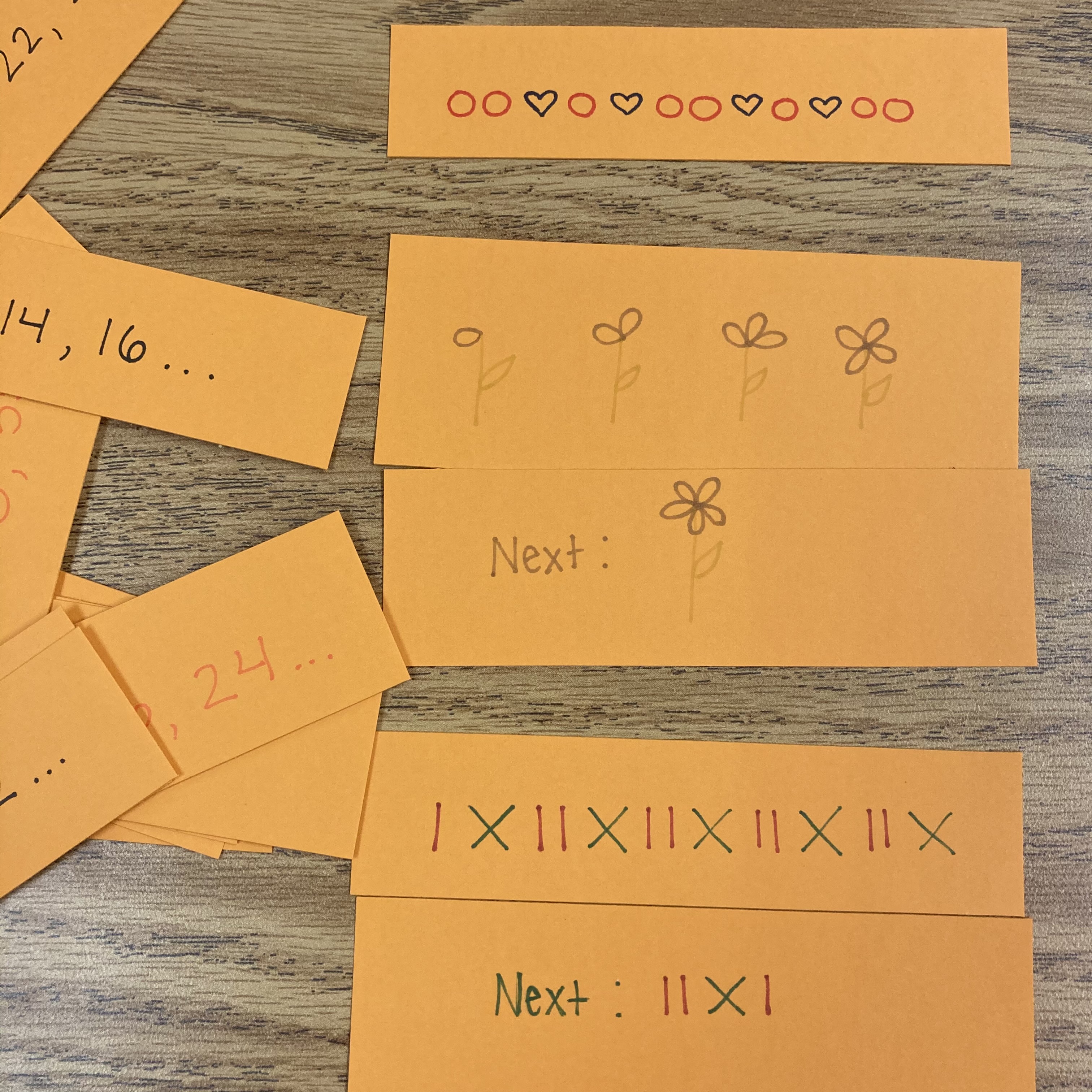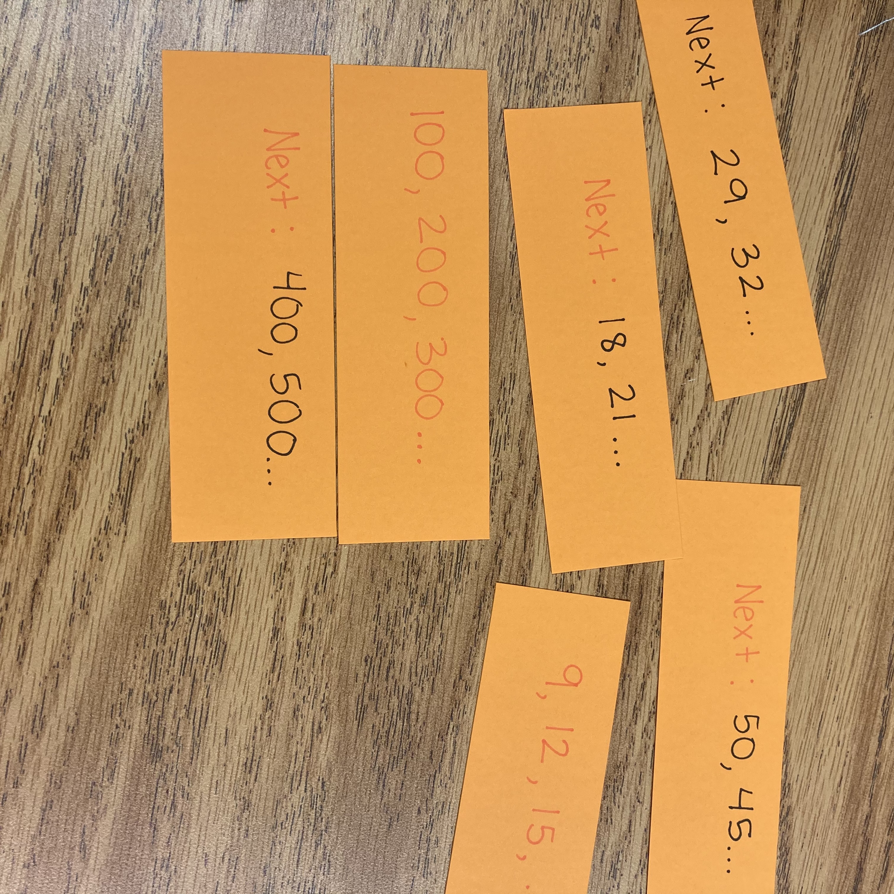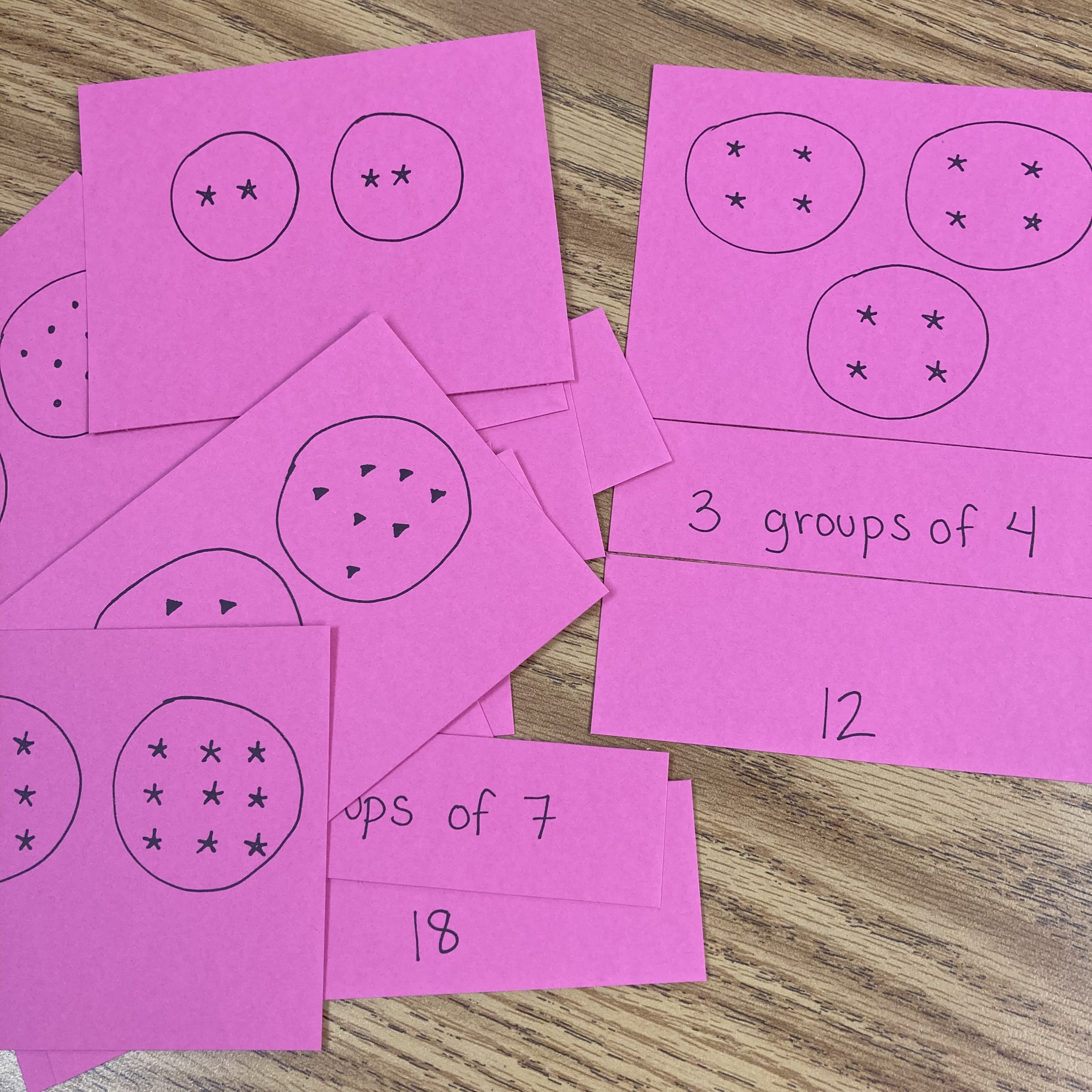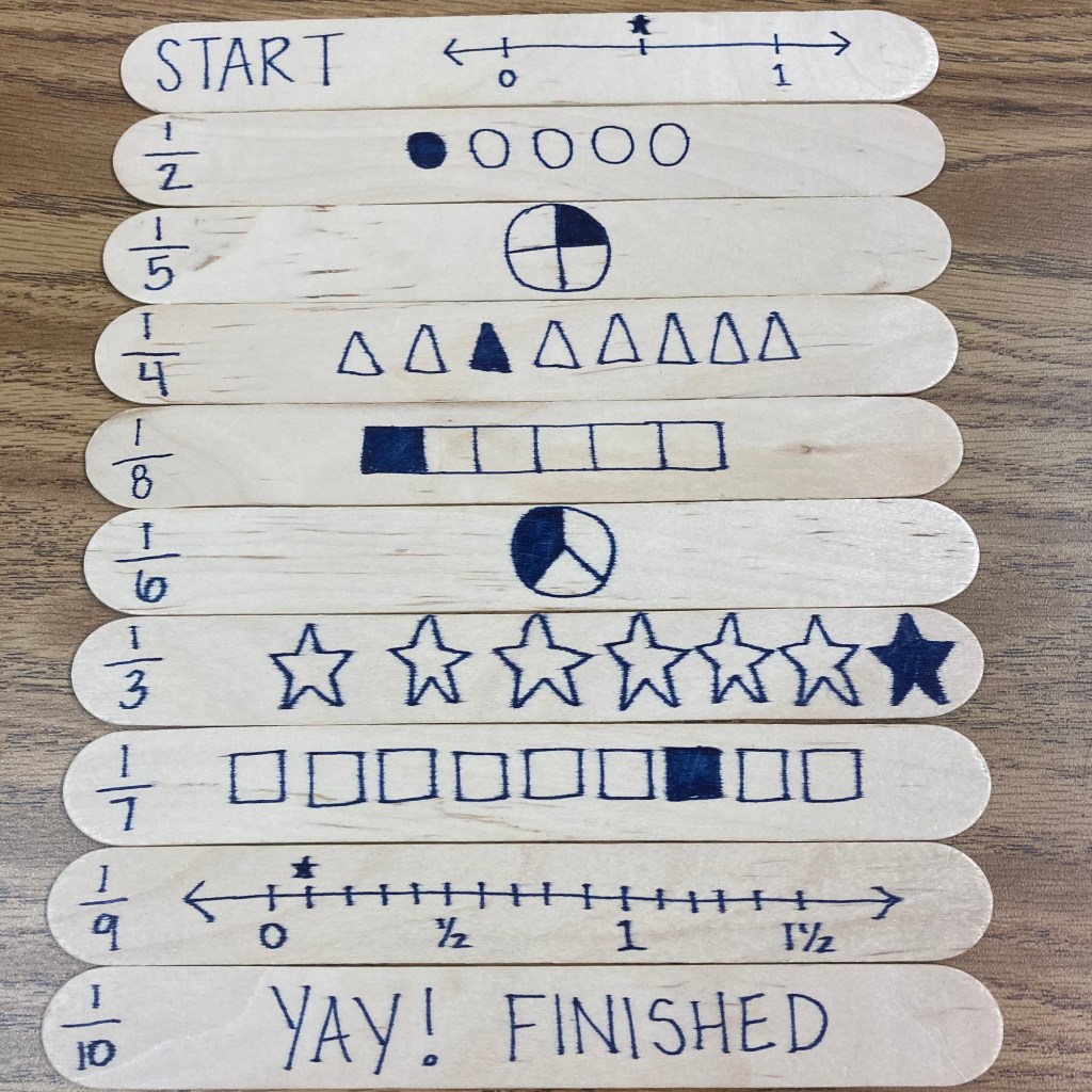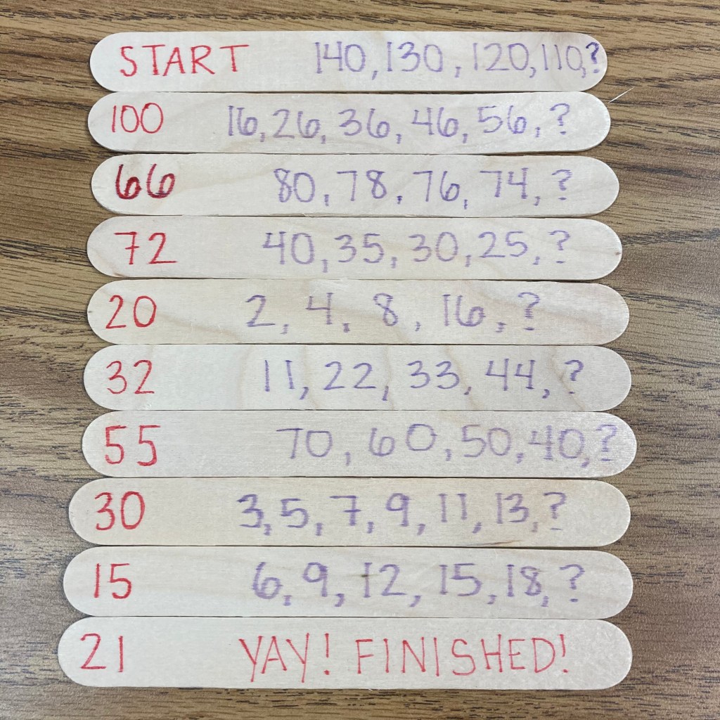 I saw this idea on Pinterest years ago. The description on the first popsicle stick was the answer on the next popsicle stick. This is just like the game “I Have…Who Has…?” that you could do whole class. If someone starts, “I have 10. Who has 20 – 3.” The next kid pipes up, “I have 17. Who has 3 groups of 5?” And so on. The popsicle sticks work the same way but one person is doing the whole list instead of it being spread out throughout the class. I like this better purely because it’s more efficient and students have to think of all the answers. I usually mark the answer on the left in one color and the question/prompt on the right side in a different color.
